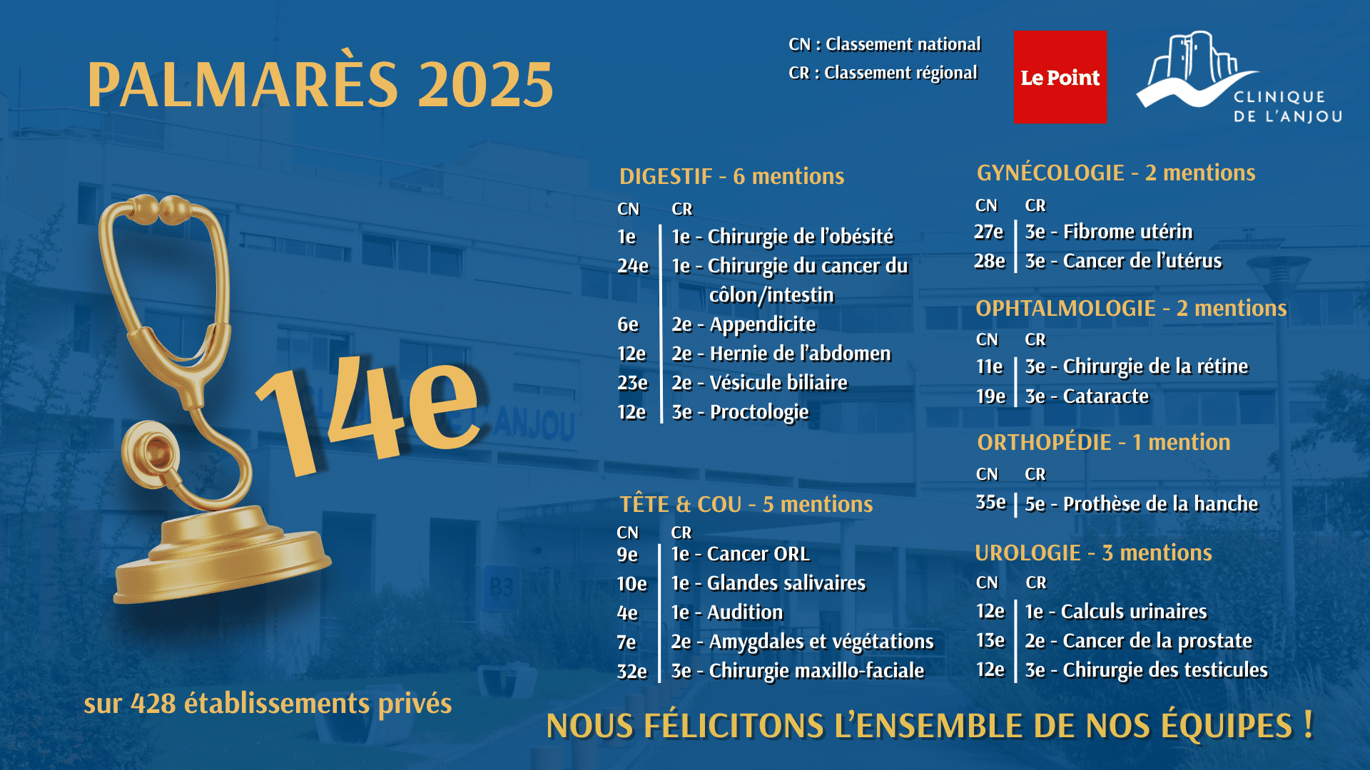 Nous sommes très fiers des résultats du classement du Point. C’est une très belle reconnaissance pour l’ensemble des professionnels et des médecins de la Clinique de l’Anjou. Nous remercions et félicitons l’ensemble des équipes.