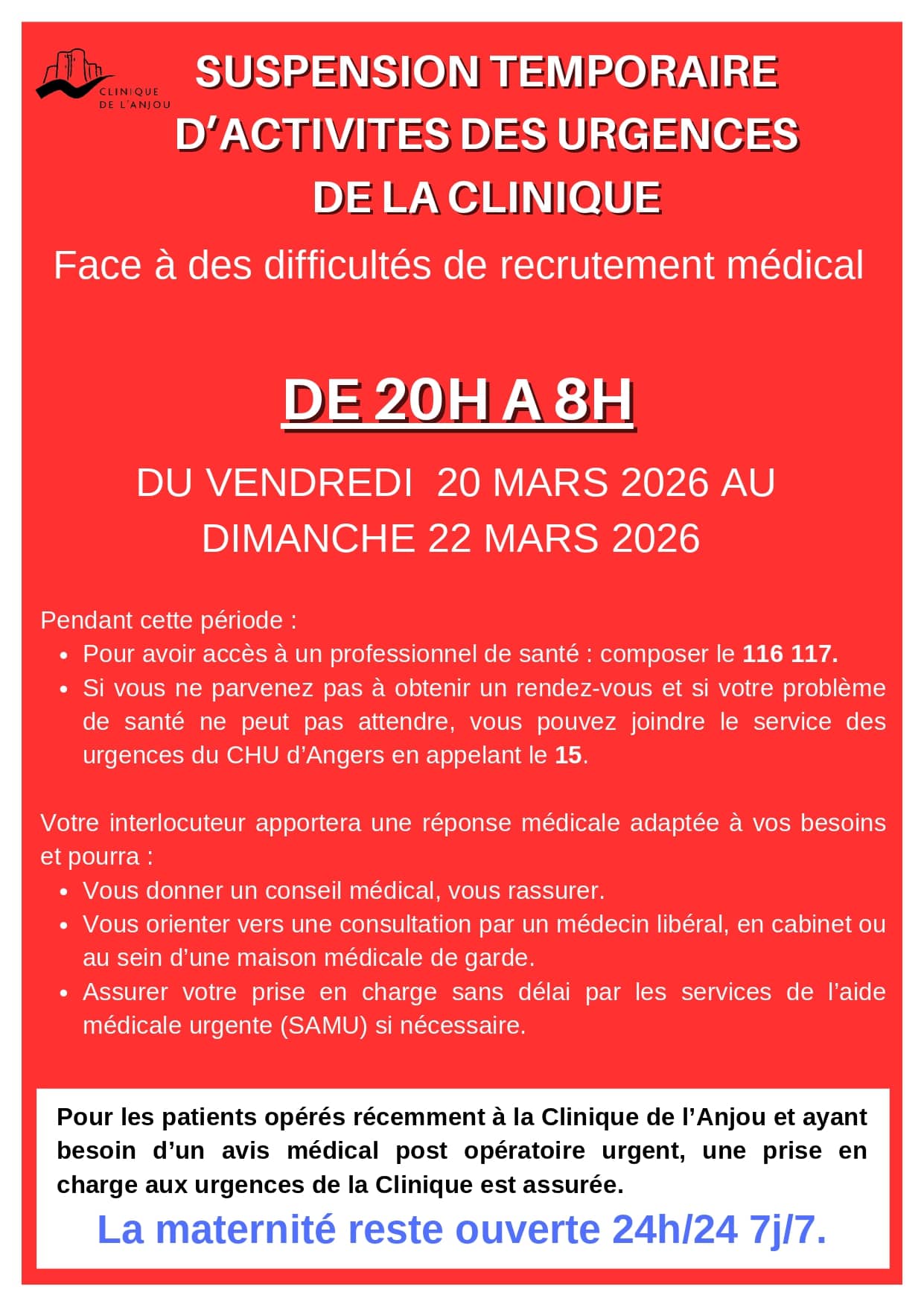 Suspension temporaire d’activités des urgences de la clinique de 20h à 8h du 20 au 22/03/2026