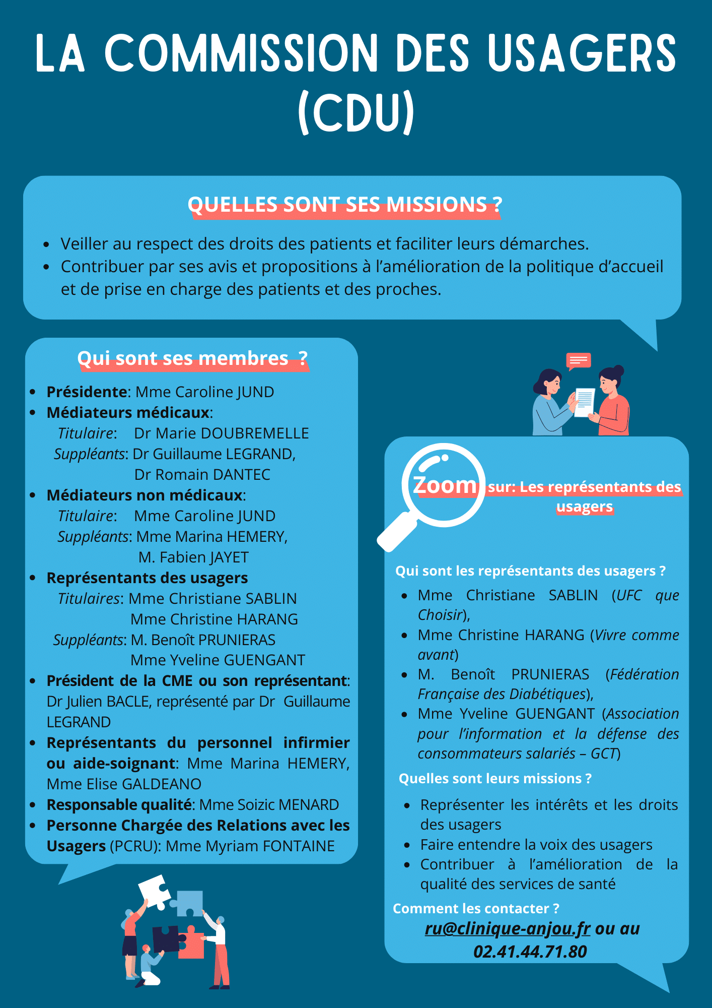 « Cette commission est chargée d’assister et d’orienter toute personne qui s’estime victime d’un préjudice du fait de l’activité de l’établissement, et de lui indiquer les voies de conciliation et de recours possibles (Art. L 1112-3 code de la santé publique) ». Vous pouvez aussi envoyer un courrier à la direction ou un mail à cdu@clinique-anjou.fr pour prendre rendez-vous avec un médiateur administratif ou médical selon le sujet.
